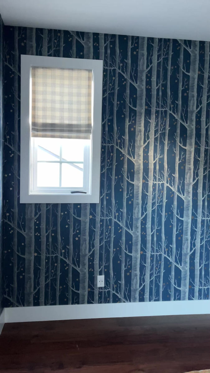 A classic Cole and Son wallpaper was installed in the boy's bedroom. The wallpaper features white trees on a blue background with gold stars. A beautiful combination of colors and modern materials.